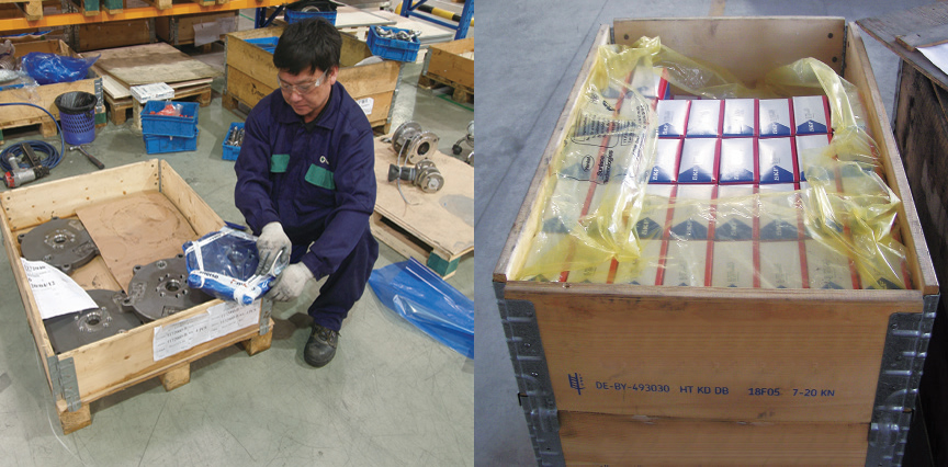 應(yīng)用圍板產(chǎn)品的便捷性、可周轉(zhuǎn)特性進(jìn)行包裝;使用刀卡結(jié)構(gòu),可靠的間隔物料;采用紙質(zhì)材料,滿足了經(jīng)濟(jì)、環(huán)保以及輕量化包裝要求;采用防銹材料進(jìn)行有效防護(hù)。